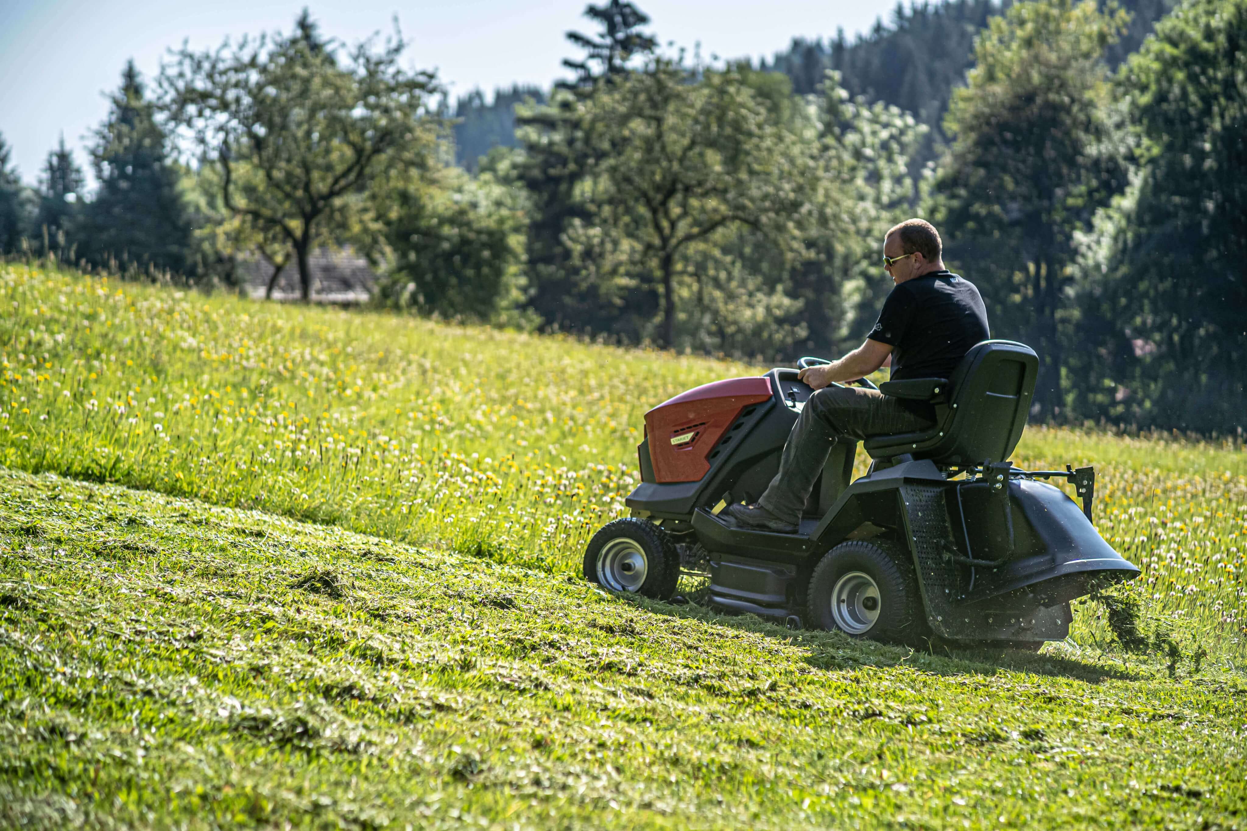 A levágott füvet a gép hátsó részén dobja ki egy csíkban levezetve.